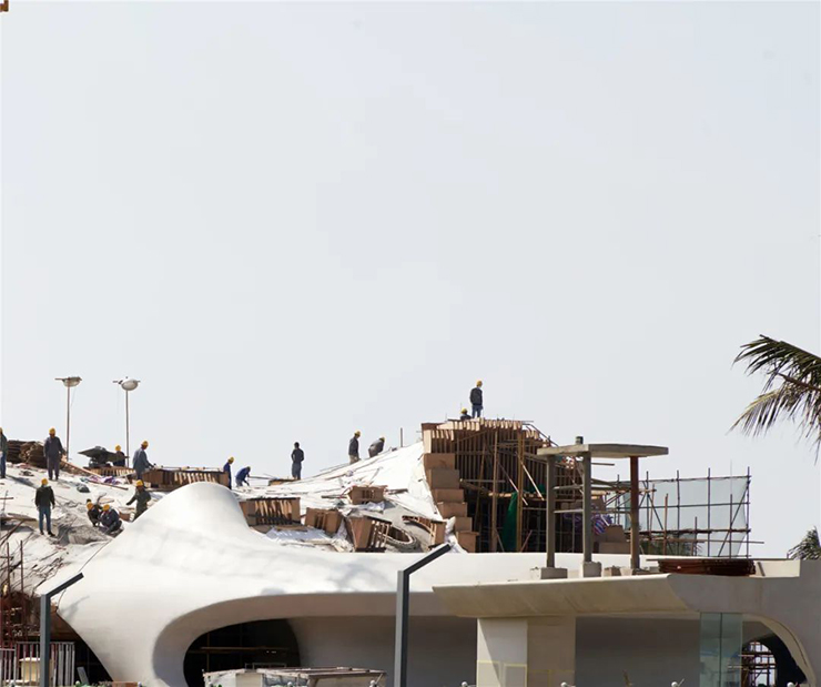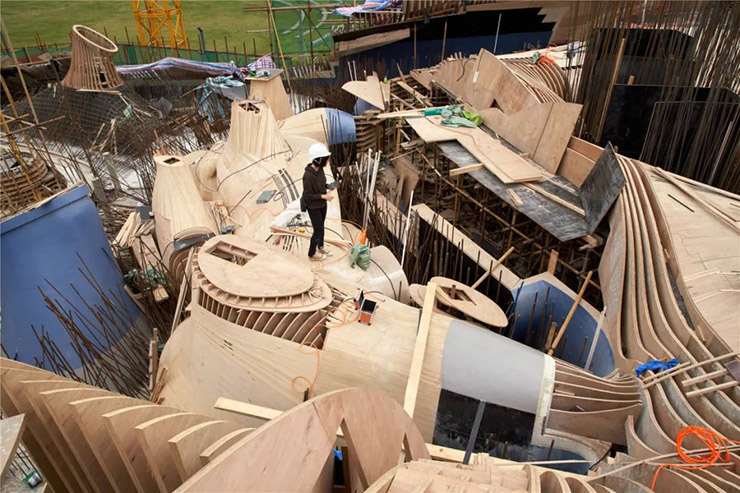 △ 駐場建筑師尚立正在檢查異形模板 攝影:奧觀建筑視覺