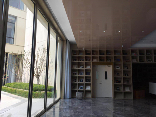 與庭院分隔成兩部分,給室內(nèi)提供一個(gè)舒適安靜的洽談環(huán)境,客戶從室內(nèi)透過大面板玻璃可以一覽庭院風(fēng)景,