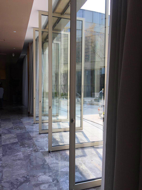 該項(xiàng)目整體采用手動(dòng)中軸門,將售樓處內(nèi)廷部分四面墻用大面板通高中軸門進(jìn)行空間分隔處理,門扇關(guān)閉時(shí),