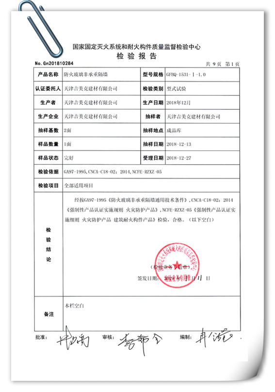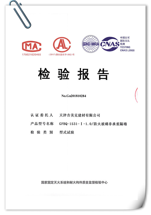 GMQ丨吉美克 A類防火玻璃非承重隔墻通過1小時耐火完整性及隔熱性型式檢驗 |
