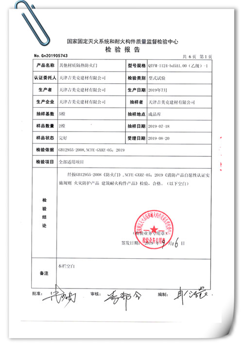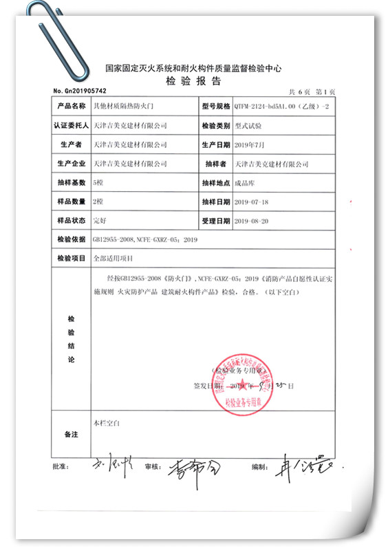 吉美克丨乙級(A1.00)防火門通過型式檢驗 |