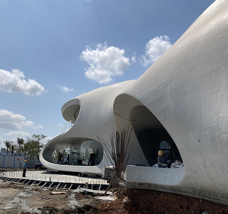 建筑由白色混凝土一體澆筑成形,內(nèi)外合一,形成多個(gè)半室外空間和平臺(tái)。卷曲的混凝土墻體,既是有機(jī)形態(tài)的建筑結(jié)構(gòu),也是連接不同空間的紐帶,墻、地、天花融成一體。大大小小的孔洞是有機(jī)的呼吸口,也將自然光線引入空間的深處。