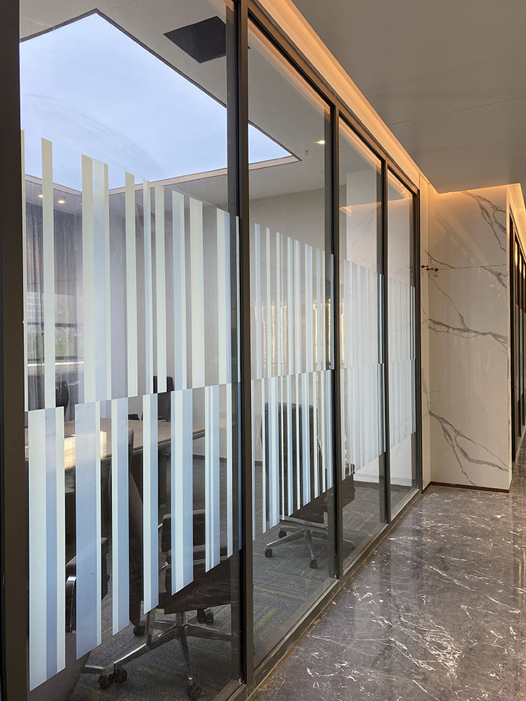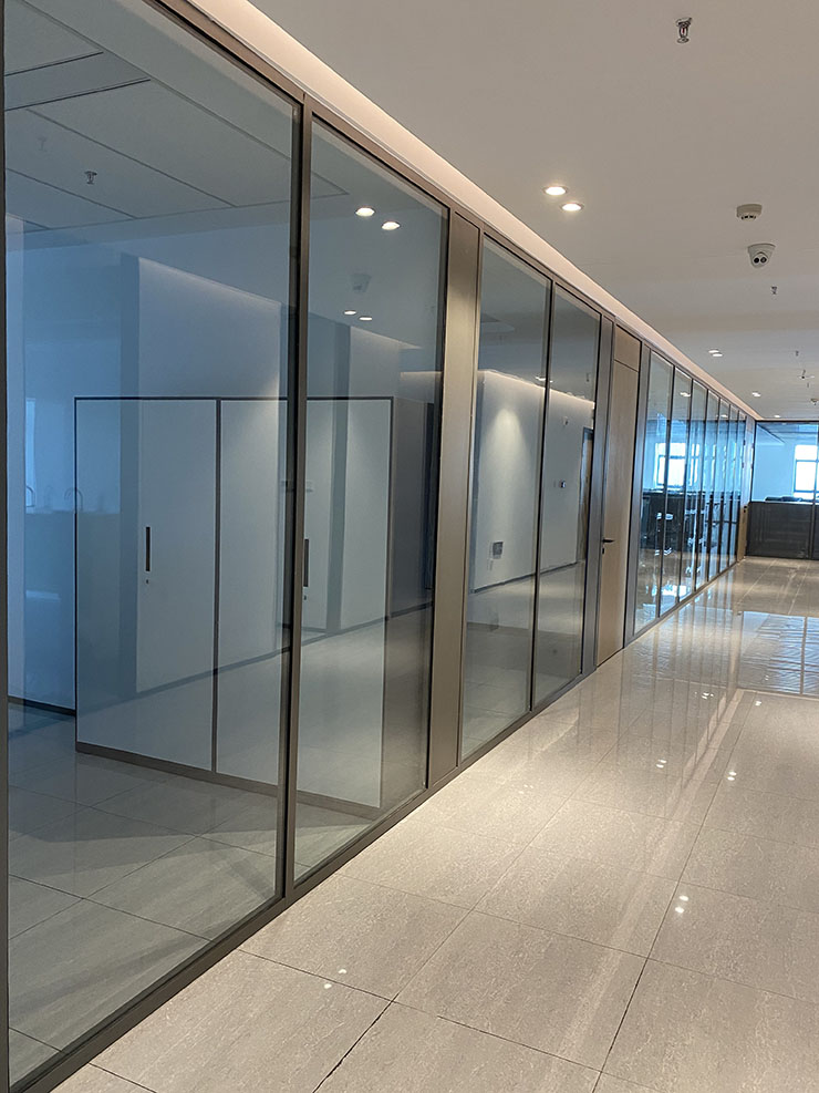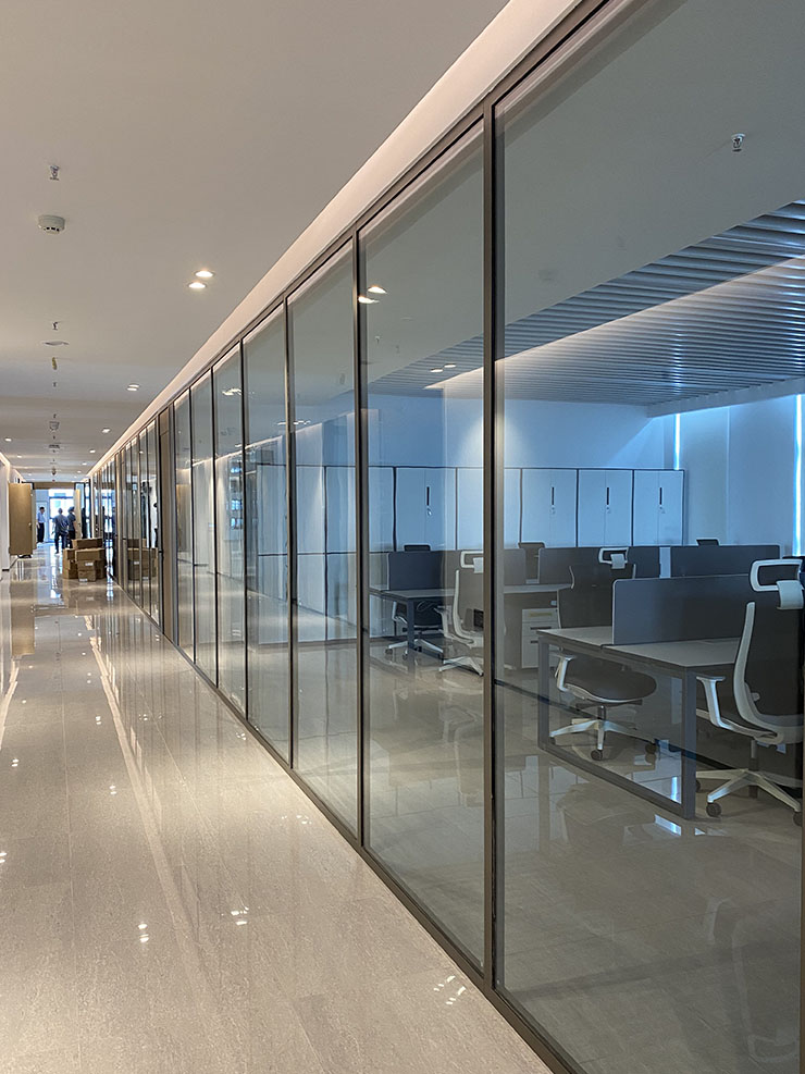 防火玻璃隔斷龍骨采用高精密冷彎型鋼,材質(zhì)Q235,整個項目一部分采用主龍骨壁厚2.5mm,防火壓板采用壁厚1.5mm,可視面60mm;另一部分材料采用主龍骨壁厚1.5mm,防火壓板采用壁厚1.5mm,可視面50mm,滿足了項目的不同需求,極窄的可視面使得隔斷整體效果簡潔大方。在保證高強度和高穩(wěn)定性的基礎(chǔ)上使玻璃面積最大化,材料表面使用粉末噴涂,其具有抗沖擊,耐磨擦,防腐蝕,耐候性能好,價格低等特點。
