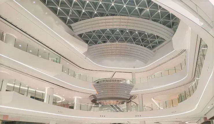 該項目采用玻璃幕墻和智能生態(tài)辦公空間相結合,打造完美相結合的藝術交互空間。中心被5G覆蓋且輔以室內(nèi)店鋪導航,享有大數(shù)據(jù)客流分析系統(tǒng),會員智能服務平臺,上德線上商城,智能停車服務等一系列智能終端,并通過全場流暢的建筑線條附以貫穿一到三層的大型雕塑感造型的LED屏、全國第二高室內(nèi)真水幕簾、“莫比烏斯”森林風格樹洞等藝術設計形成視覺中心,演繹空間藝術美學,為客戶打造了靈動的環(huán)境空間與別致的互動體驗。