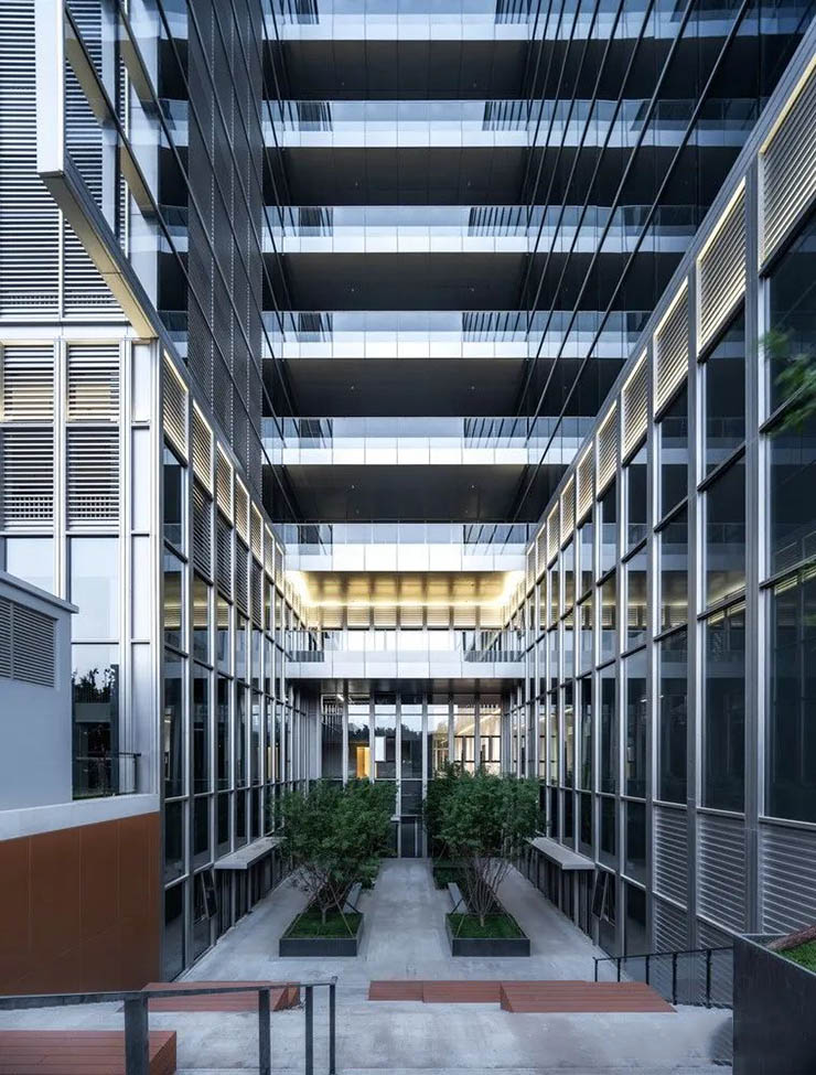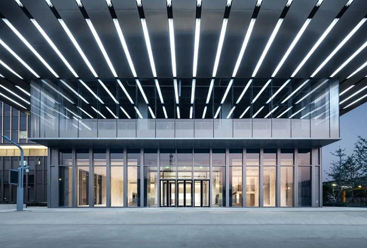 我公司承建該項(xiàng)目64樘鋼制隱框地彈門,產(chǎn)品采用我公司專利研發(fā)隱框技術(shù),門體采用鋼制框架,使用彩釉玻璃外置安裝方式隱去門框,使得門與玻璃幕墻融為一體,兼具建筑美學(xué)效果,塑造出高層工業(yè)廠房純凈簡(jiǎn)潔、輕盈通透的外觀形象,突破人們對(duì)傳統(tǒng)工業(yè)廠房形象的認(rèn)知,搭配數(shù)字樓宇、智能化設(shè)施以服務(wù)企業(yè)員工,為大家提供更加賞心悅目、更加舒適的辦公空間。