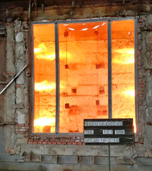 非隔熱型鑲玻璃構(gòu)件的耐火性能試驗(yàn)是根據(jù)GBT/12513《鑲玻璃構(gòu)件耐火試驗(yàn)方法》標(biāo)準(zhǔn)進(jìn)行的,將防火玻璃與框架組合好后鑲嵌在墻洞中。