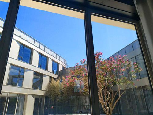 與庭院分隔成兩部分,給室內(nèi)提供一個(gè)舒適安靜的洽談環(huán)境,客戶從室內(nèi)透過大面板玻璃可以一覽庭院風(fēng)景,