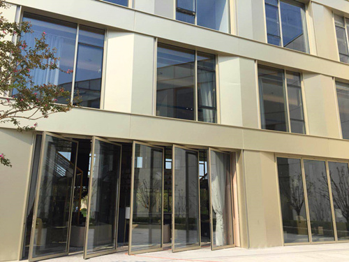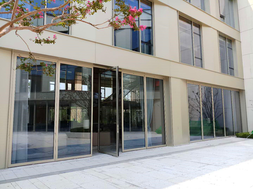該項(xiàng)目整體采用手動(dòng)中軸門,將售樓處內(nèi)廷部分四面墻用大面板通高中軸門進(jìn)行空間分隔處理,門扇關(guān)閉時(shí),
